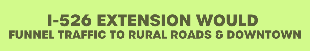 WHILE HEAVY TRAFFIC ON I-526 IS A KNOWN ISSUE, THE PROPOSED EXTENSION WILL NOT FIX THIS PROBLEM. IN FACT, IT IS LIKELY TO WORSEN IT BY INTRODUCING MORE CARS ONTO TWO-LANE RURAL ROADS AND PUSHING CARS INTO AREAS ARE ALREADY STRUGGLING TO MANAGE EXISTING TRAFFIC.
