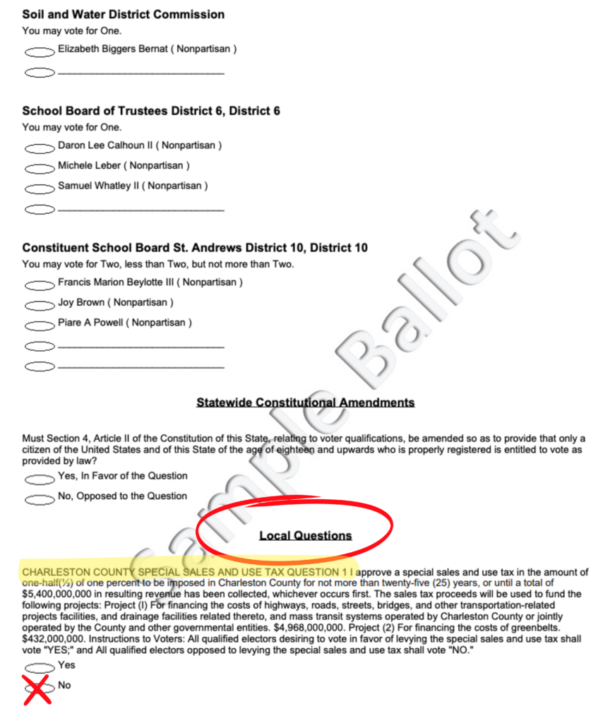 The I-526 Extension was the only priority project listed for this tax, meaning the money would first be spent to fund this project, draining funding from other priorities. This county has higher priorities, including completing road projects that were voted on in the 2016 referendum but are yet to be finished. Although funding for the Greenbelt program—which helps fund conservation projects for land protection and establish public access to land, bike, and pedestrian infrastructure—was listed on this tax, the allocation was been cut drastically compared to the 2016 and 2004 sales taxes, making it a bad deal.