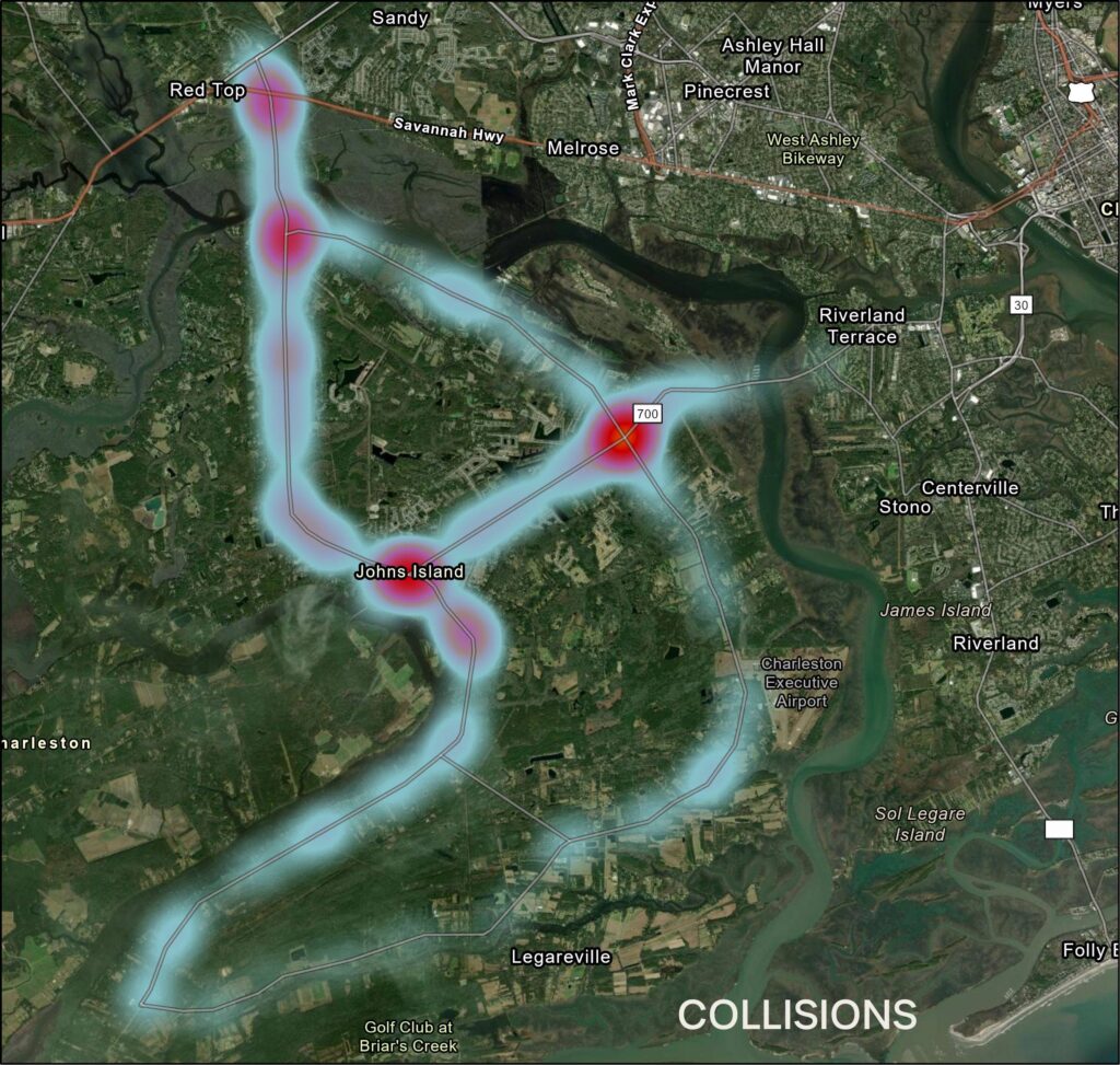 The final image, also derived from the same data set shows where the highest number of traffic collisions occur on Johns Island:
