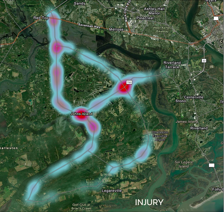 The following heatmap comes from accident data for the period 1/1/2010 to 10/30/2020 from the Office of Highway Safety and Justice Programs in the South Carolina Department of Public Safety. The larger/darker red dots show where the highest amount of collisions with injuries happen on Johns Island: