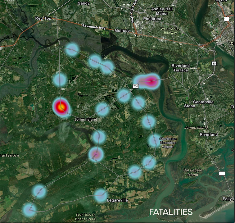 The next image, derived from the same data set shows where the highest number of traffic fatalities are located on Johns Island: