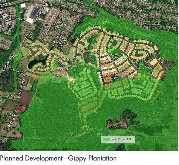 Gippy and Cainhoy serve as bookends of threats to the Cooper River corridor. Gippy could have over a thousand new residential units that will put immense strain on local scenic roads and risk exacerbating drainage issues on surrounding neighborhoods at the northern end of the Cooper River corridor. Cainhoy is expected to have at least 9,000 new residential units on either side of Clements Ferry Road on the southern end of the Cooper River Corridor. This will cripple the already overly congested Clements Ferry Road, 526, and Highway 41 and threatens to destroy the ecological resources adjacent the Francis Marion National Forest.