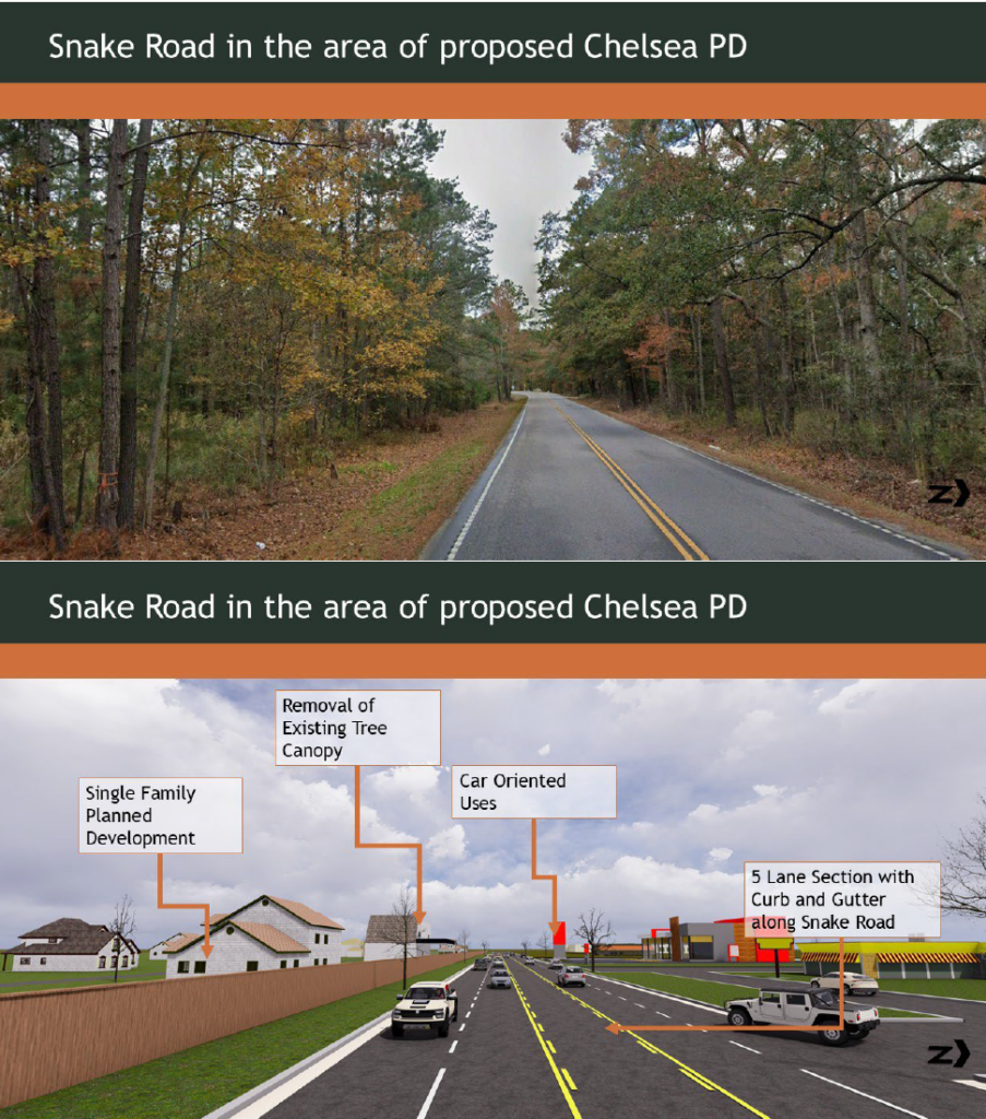 The following illustrations show “what could have been” if community members had not rallied against the proposed Chelsea South PDD along Snake Road in 2022.